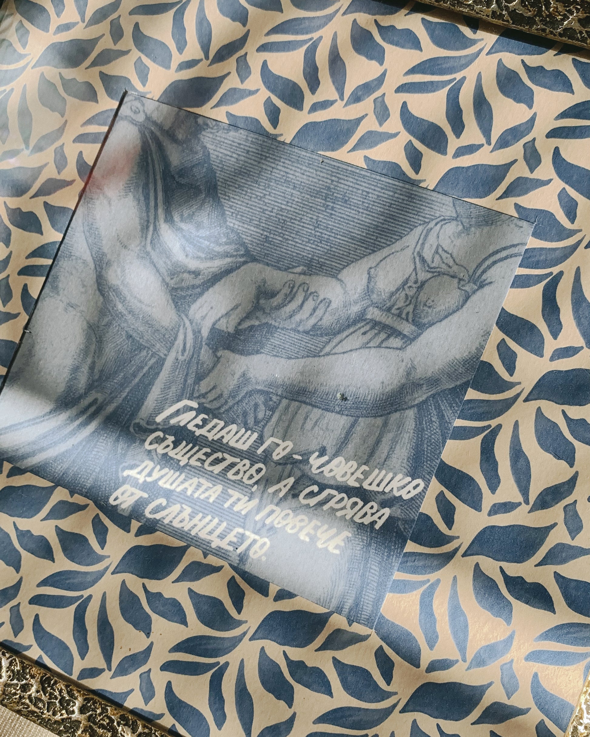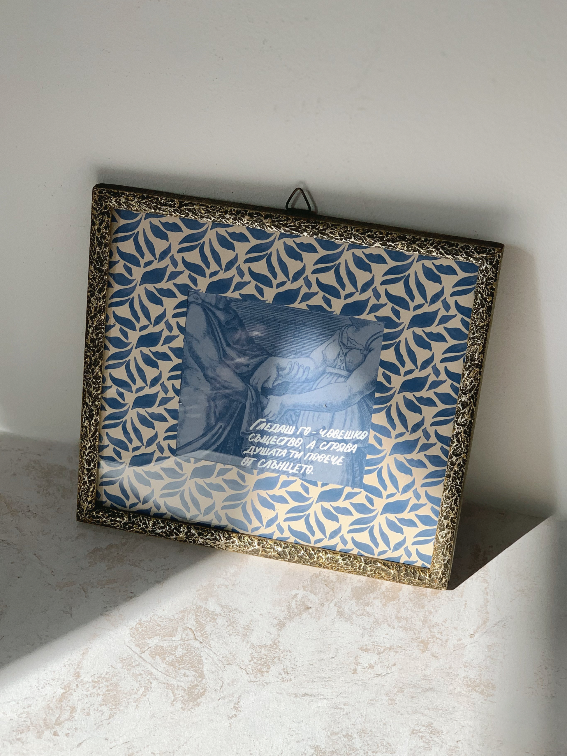 Рамката е изключително красива, с орнаменти със златисти и сребристи отенъци върху себе си. Около основния принт поставих паспарту от същата хартия с ръчно създаден десѐн.